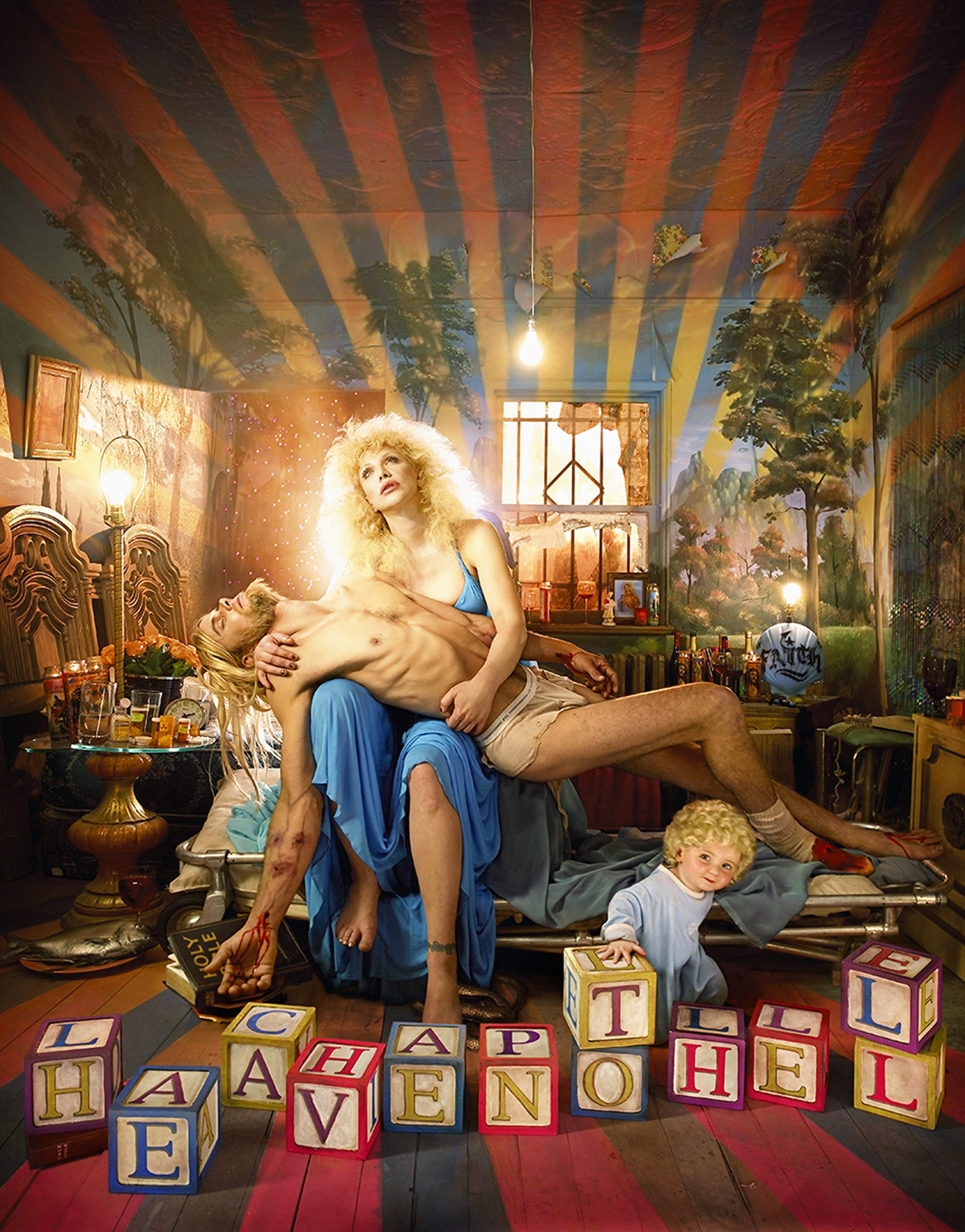 Again, this photograph has a Renaissance precedent. LaChappelle’s Pieta is based on Michelangelo’s sculpture of the same name, which depicts Mary holding Christ after the crucifixion. Here, Mary has been substituted for Courtney Love, cradling a model doppelgänger for Kurt Cobain. “LaChappelle plays with contemporary celebrity and its place in our society then links it beautifully to classical portraiture and painting,” says Sweet. “It’s a tragic image.” Is the image of Love as Mary and Cobain as a fallen Christ figure, complete with stigmata, not just a little bit blackly funny? “Funny?” says Sweet. “I wouldn’t have used that word. It’s his interpretation of the classic images, and it’s up to us to interpret them. You find it funny, I find it quite sad.”
