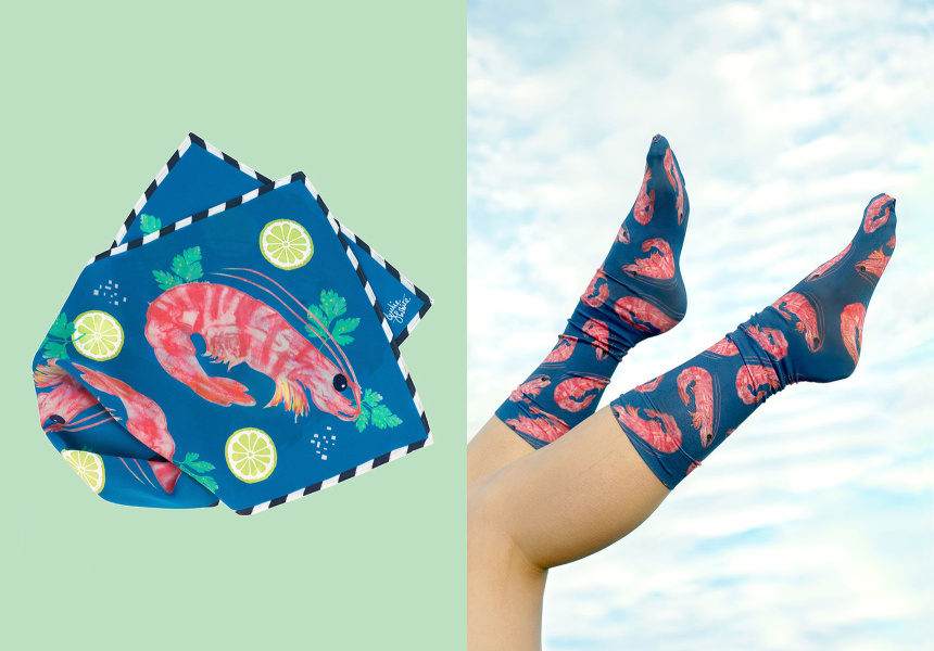 Suddenly, the absurdity of retro-Australiana is something to be celebrated. We’ve seen it in the dedicated aesthetic of Client Liaison, the resurgence of Ken Done and now, Julie White is decorating our feet with prawns.