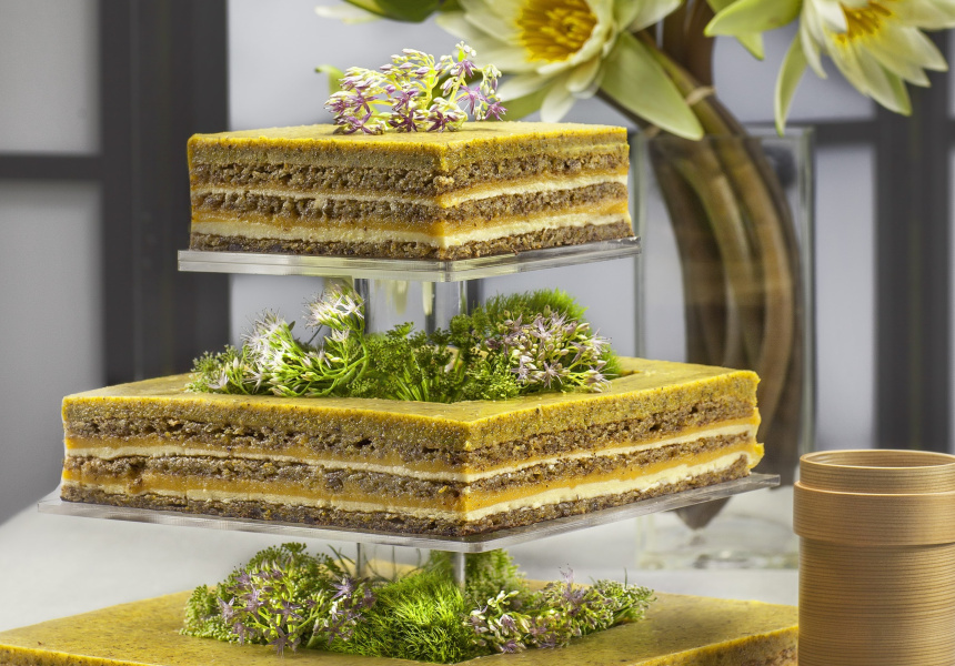 In addition to chocolate eclairs, frangipane tarts, custard flans and macadamia brownies, the patisserie’s core cake range will be available in its entirety. So you’ll be able to try the famous gluten-free strawberry and watermelon cake, as well as a black-sesame butter cake with coconut mousse (topped with yuzu jelly and dai dai, an Asian variety of bitter orange), a chocolate hazelnut torte, and an orange cake with Persian figs.