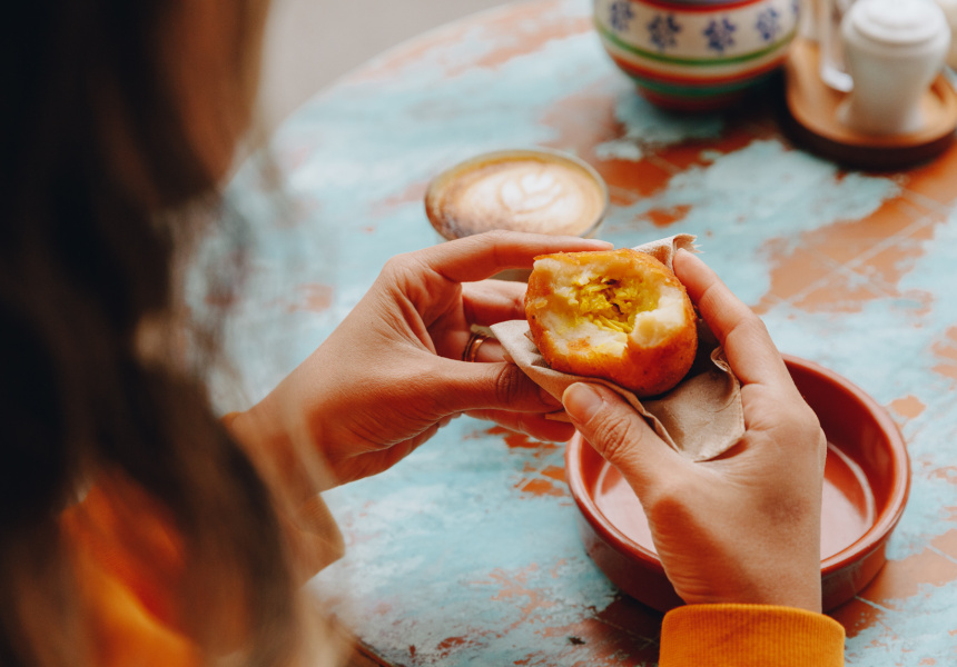 Coxinha are pear-shaped croquettes – great for a quick breakfast – which are crunchy on the outside and filled with shredded chicken and cream cheese and served with a dollop of creamy chilli sauce. A vegan version is made with palm hearts.