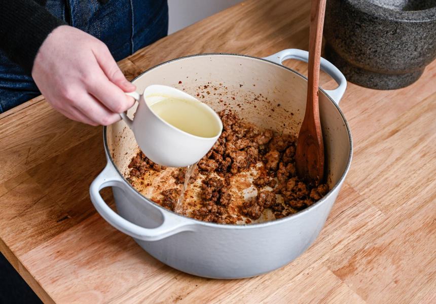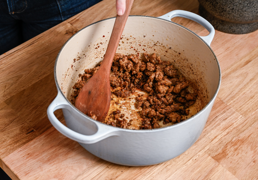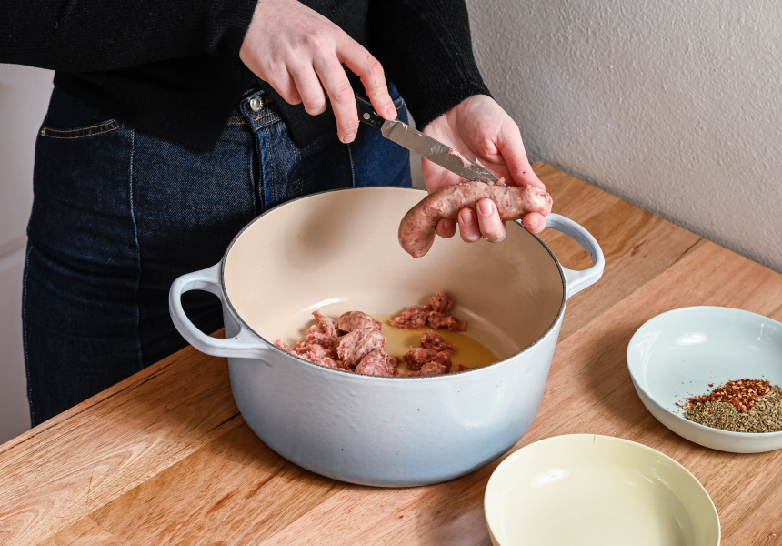 McIntyre’s take on the recipe includes a simple but often overlooked shortcut to flavour: fennel seeds. “There aren’t many recipes that I use in life that use fennel seeds all the time, and I just think it’s such a beautiful flavour,” says McIntyre. The fennel flavours also come through in the Italian sausage.