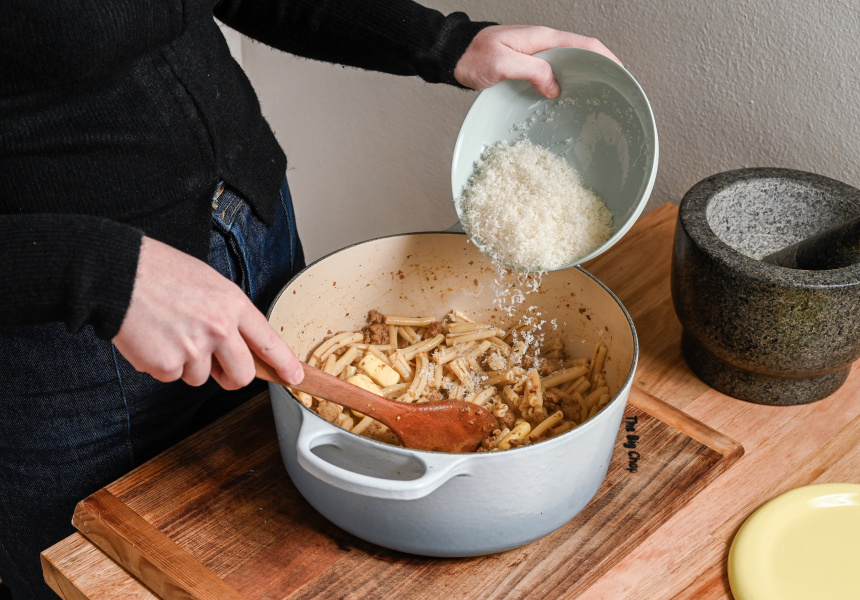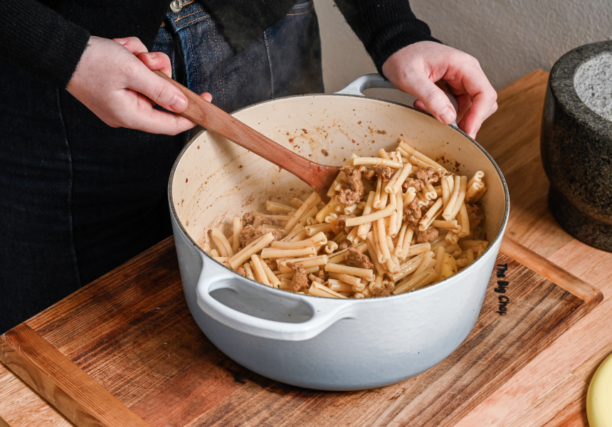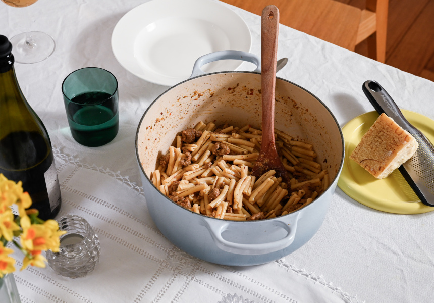 Whatever style of pasta you have on hand will work. “I used to make it with spirals, but recently I’ve loved it with rigatoni,” says McIntyre. “It picks up the most sauce, and I love that the sausage tunnels its way into the rigatoni.”
