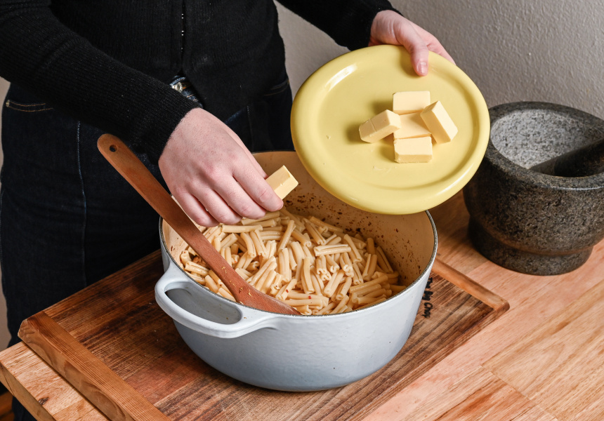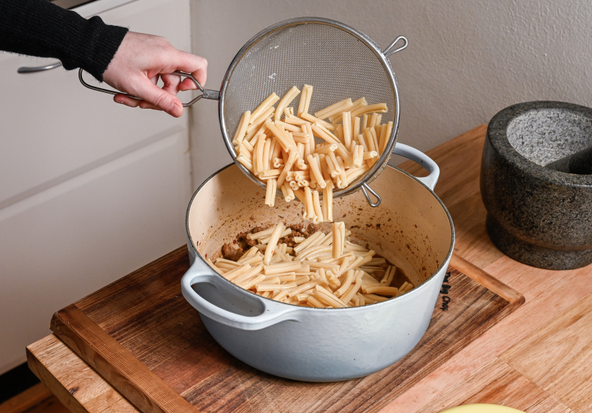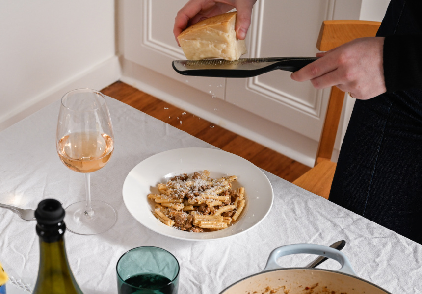 For McIntyre, cooking and sharing food creates comfort that is hard to find elsewhere. “I used to do a lot of schnitzels and tasty, hearty things that have a lot of nostalgia to them,” she says. “Things that feel like you’d have them at home or your mum would cook them for you.” It’s the same approach she’s taken with this pasta recipe, which has grown from a childhood favourite into a Friday dinner staple. “It’s a recipe for an old Jamie Oliver pasta, but it’s kind of been adapted,” says McIntyre. “My mum used to make it for me when I was a kid, and over the years I’ve tweaked it to make it saucier and heartier.”