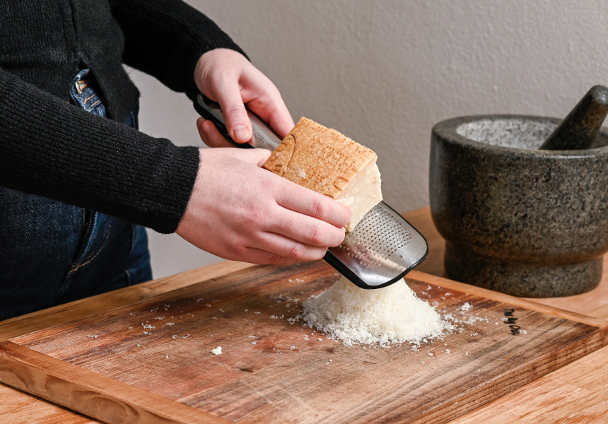 Remove from the pan, place on a platter, and grate Parmesan all over before serving.