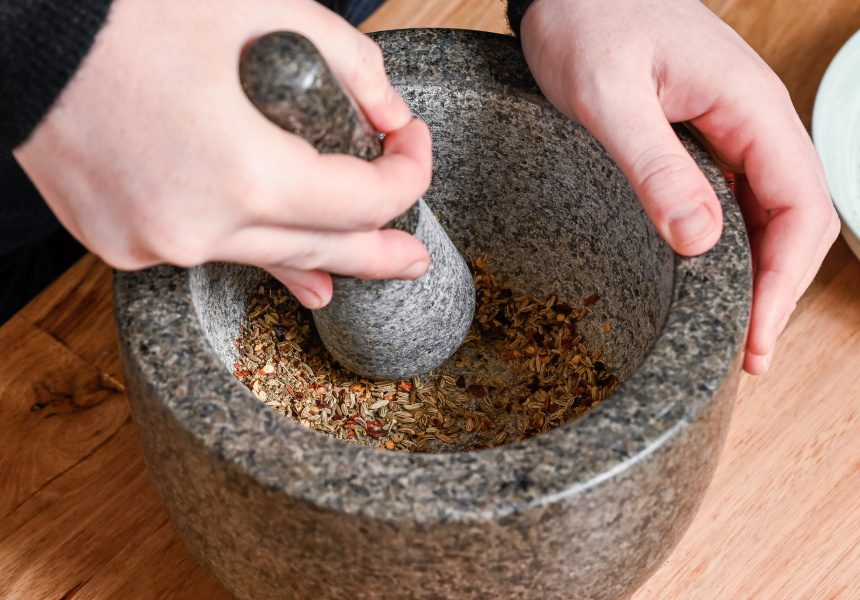 Add oil to pan and fry sausage, breaking it up with a wooden spoon. While it fries, crush fennel, oregano and chilli in a pestle and mortar.