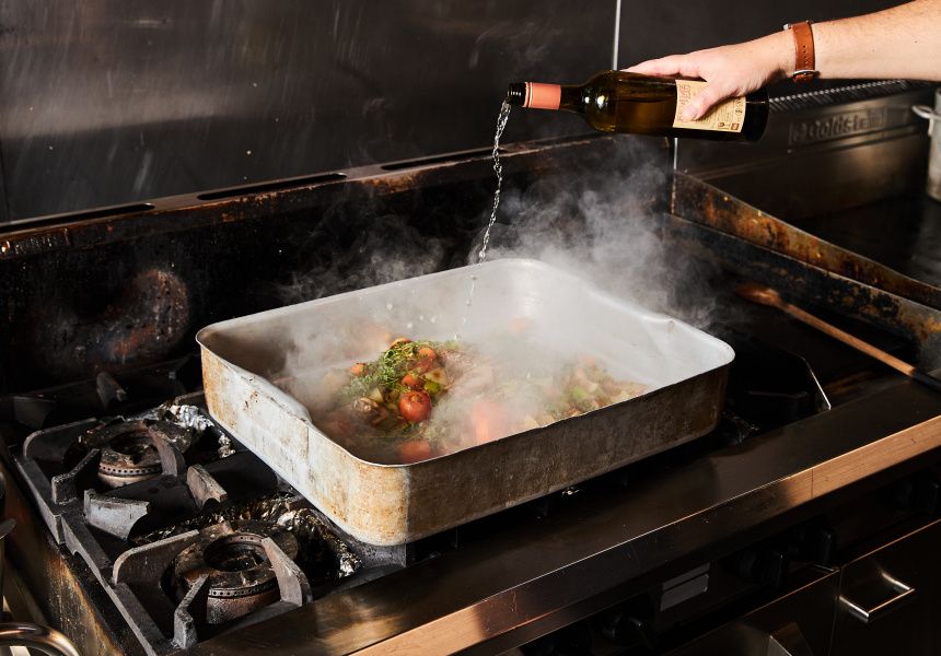 When there’s only three elements to a dish, it’s worth making sure each is bringing something to the table. First, focus on the gravy, which Moore vividly describes as tasting like “a charcoal chicken shop in liquid form.” The gravy uses a twice-infused chicken stock which supercharges all those intense, savoury flavours. “You can actually make your gravy the day before if you want to,” says Moore. “It’s only going to deepen in flavour in the fridge overnight.”