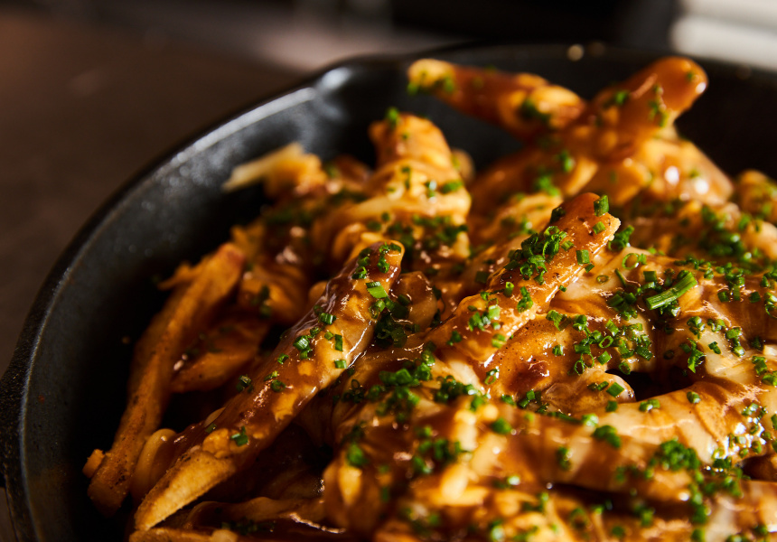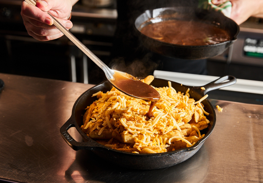 From there, spread your chips in your serving vessel of choice and add cheese. Australians can basically forget finding poutine-style cheese curds anywhere, so Moore recommends a bag of shredded cheese designed for a stringy melt – a pizza or Mexican blend is ideal. “Whatever blend you want to use, put it straight over the top of the chips and then make sure your gravy’s nice and hot,” he says. “Hit it over the top while it’s hot and serve it straight away. Don’t let it sit there and get soggy – get straight in.”