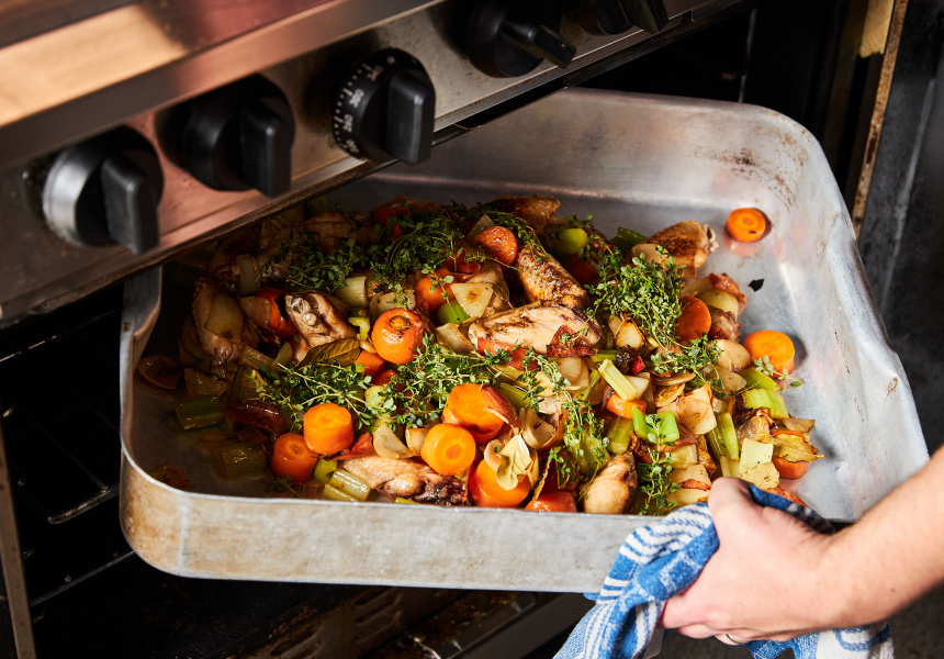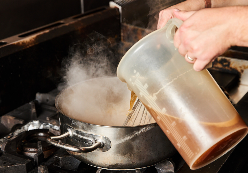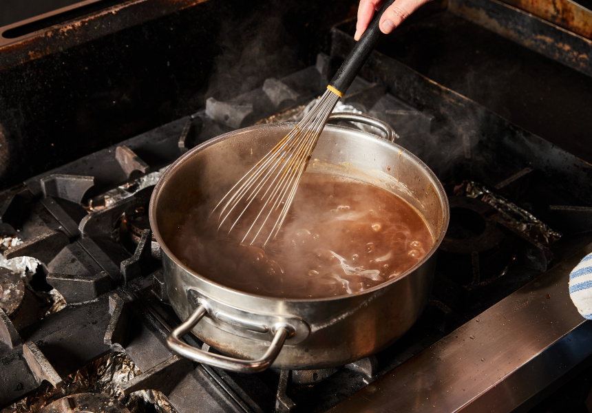 To get started on the gravy, you’ll want two litres of a nice chicken stock ready to go. “Then we get a whole bunch of chicken wings, which are super rich in chicken flavour, and roast those,” says Moore. Add some onion, carrots and celery to the tray, then once roasted, deglaze with a little wine or sherry. Then add everything to the premade stock and let it bubble away for up to two hours to finish the double stock.