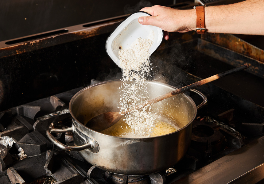 “After we’ve got the ultimate double chicken stock, we cook it down with butter, flour and wine,” says Moore. “Then we let it reduce until it starts to get thick.” You’re shooting for a gravy thick enough to coat the back of a spoon. “Much runnier than that and it ends up leaking all over the bottom – you want it to be able to sit on the top and be able to melt everything without having a big puddle on the bottom of your plate.”