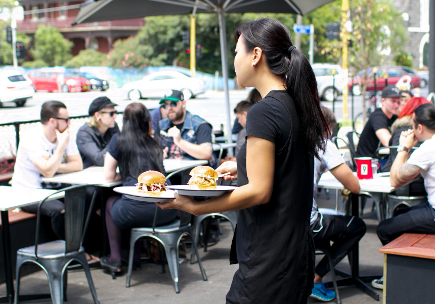 Up in Smoke is a sleek, masculine space, with a back bar and main dining area, with concrete table tops, black-leather chairs and charcoal-black brick walls. There’s a beer garden out front, and diners can get stuck into the many craft beers available. There’s also a good selection of bourbon and other brown liquors, and a decent wine list.