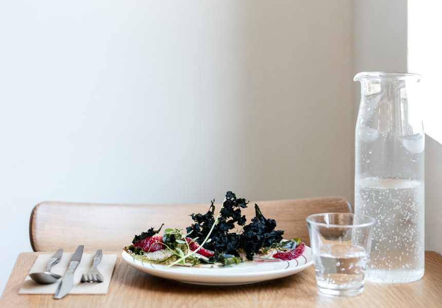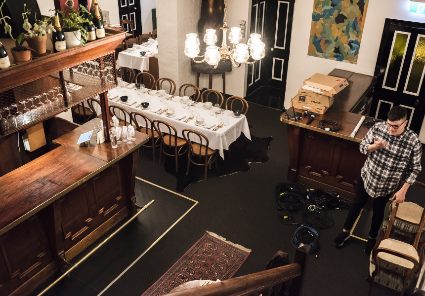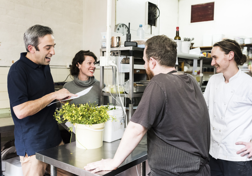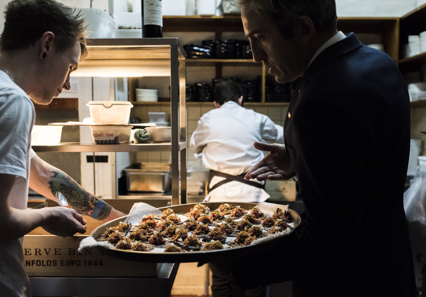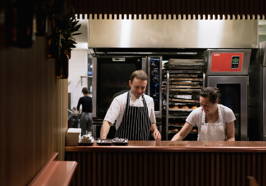 At 6pm Mason leads the floor as guests start filing in. The takeaway area is already abuzz with customers dashing in for their orders, and by 7pm Mason is coordinating the serving of plates such as pressed lamb belly with Adelaide Hills peas, wild garlic flowers and oyster mushrooms.