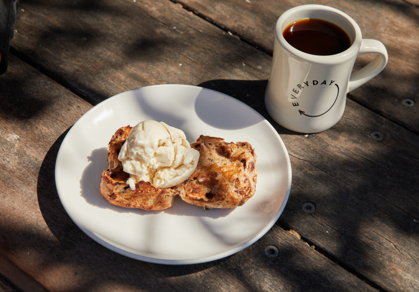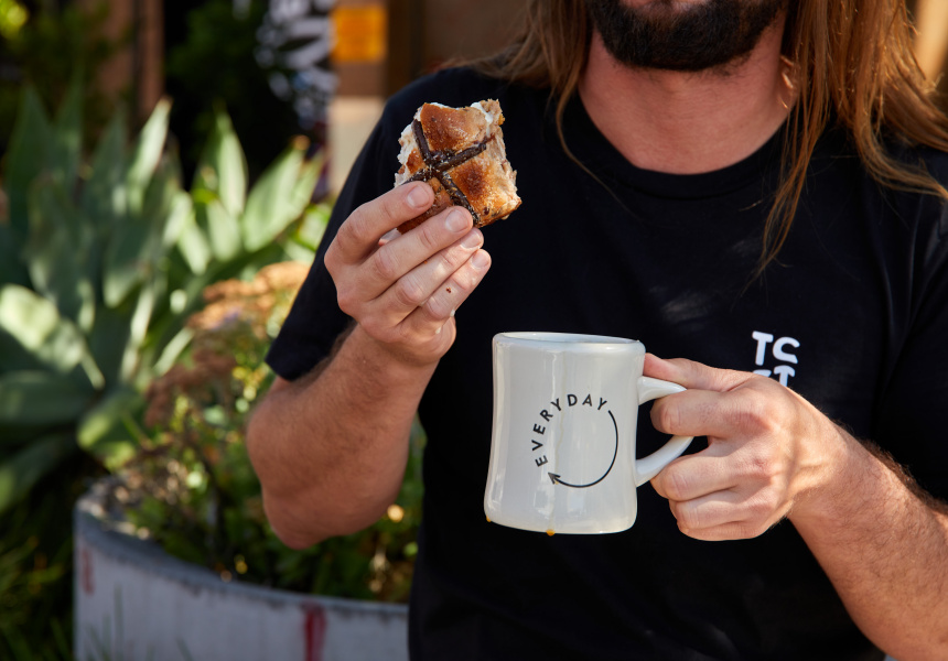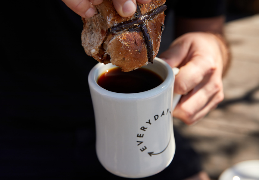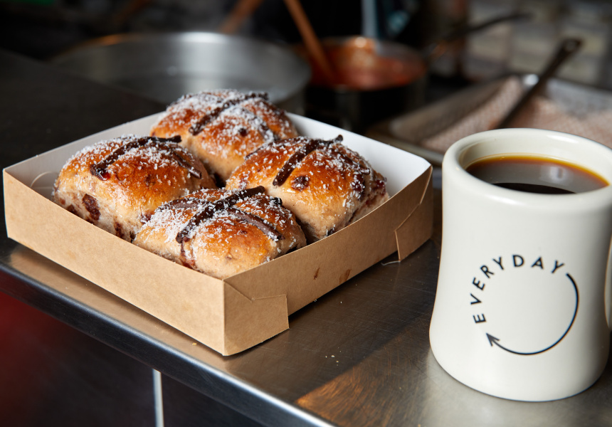 Free’s beverage pairing of choice is obviously coffee, preferring Everyday Coffee’s autumn blend, filter-style to wash down those hot cross buns. “They’re pretty good standalone and the only thing that makes it better is washing it down with a black coffee,” says Free. “Even just dunking it in. It’s kind of comparable to that donut vibe.”