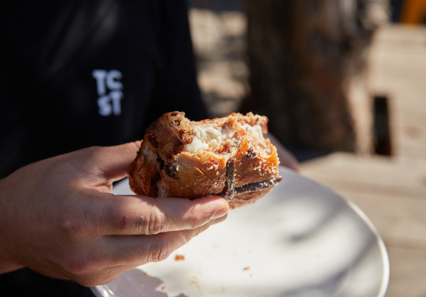 Left-of-centre flavours like Bakers Delight’s new Berry Ripe Hot Cross Bun are more Free’s speed than the standard fruit-and-spice style. Even with the souped-up buns, Free is happy to take things a little further. “You could put a scoop of ice-cream on that for sure,” says Free. “A little ice-cream sandwich would be delish. Still toast it, so that it’s just sloppy and dripping and you’d probably eat it over the sink. A sort of Bridget Jones, in-your-PJs guilty pleasure, I reckon. I wouldn’t be shy to still put butter on it as well, to get that salty-sweet combo.”
