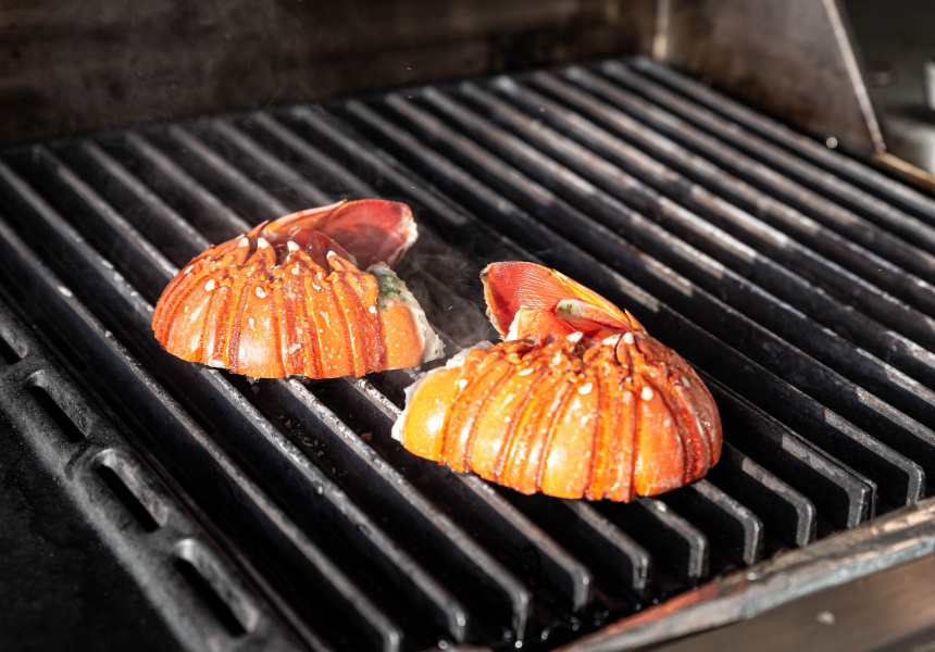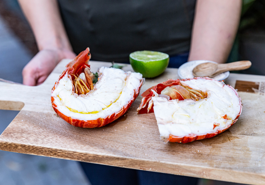 With the butter applied to the flesh of both lobster halves, you’ll want to get it on the barbeque. Turland’s technique here cooks the lobster with the shell side down to take full advantage of all those melding flavours. “The little trick that I love to do is make sure that you cook your lobster just in the shell most of the way, and the butter ends up dripping into the lobster shell and becomes essentially a cup with all the lobster juices and butter,” Turland says.