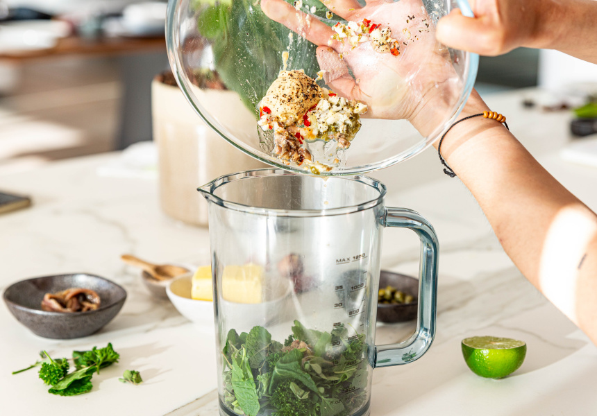 Lobster is delicious enough, so Turland isn’t overdoing it here. The additional flavour in the dish comes from a compound butter – essentially, butter with added flavourings – so you’ll want to start by mixing capers, Dijon mustard, anchovies, garlic, chilli, lemon and herbs until well combined. Then, mix through soft butter. “It’s just light, fresh, zingy flavours, and they’re ingredients that are easy to come by, and the majority of people have them in the cupboard,” says Turland.