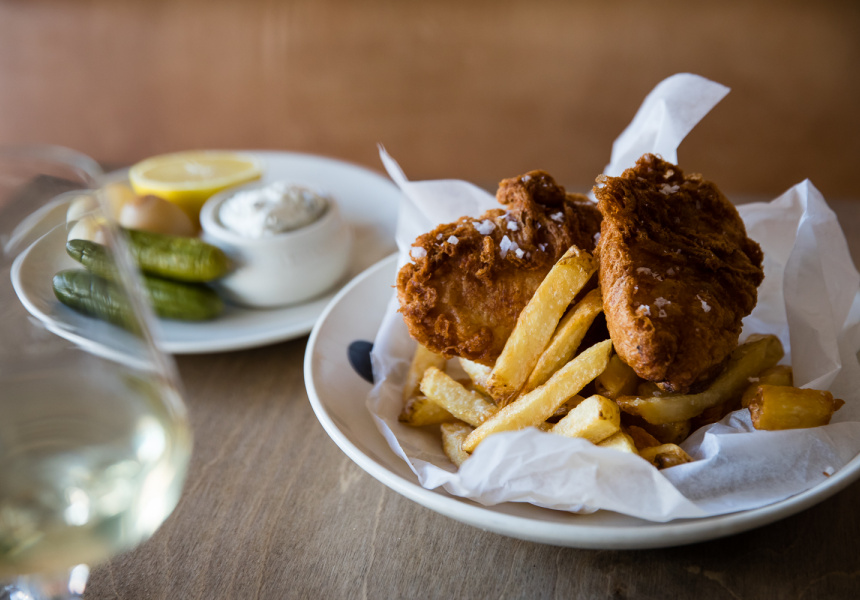 Other non-Australian chefs also feature in the Nilands’ story, although not always in obvious ways. The couple’s four-month “working honeymoon” at Heston Blumenthal’s The Fat Duck, for instance, isn’t referenced by levitating squid rings or guests being presented with iPods preloaded with classic Australian sea shanties, but rather in the superb crunch and shatter of Saint Peter’s deeply tanned fish and chips. Turns out that adding beer and a slug of vodka – a little hack he picked up during his time in Bray’s most famous kitchen – renders batter extra-crisp as the alcohol burns off. Made using pink ling and served with a yoghurt- rather than mayonnaise-based tartare sauce and properly brilliant skin-on, just-waxy-enough chips, it’s a fish meal that absolutely deserves white plates and good cutlery. Still, with every forkful of juicy fish, I couldn’t help fantasise about eating the dish somewhere I could feel sand between my toes, hear and smell the ocean and discreetly steal mouthfuls of chilled riesling from a thermos. And in the spirit of thinking really big, I’d bring along a friend and pack the restaurant’s whiting kiev – a carefully deboned whole fish stuffed with garlic butter that’s crumbed and fried like history’s greatest seafood crumbed sausage – and have a beachside picnic for the ages.