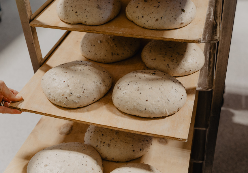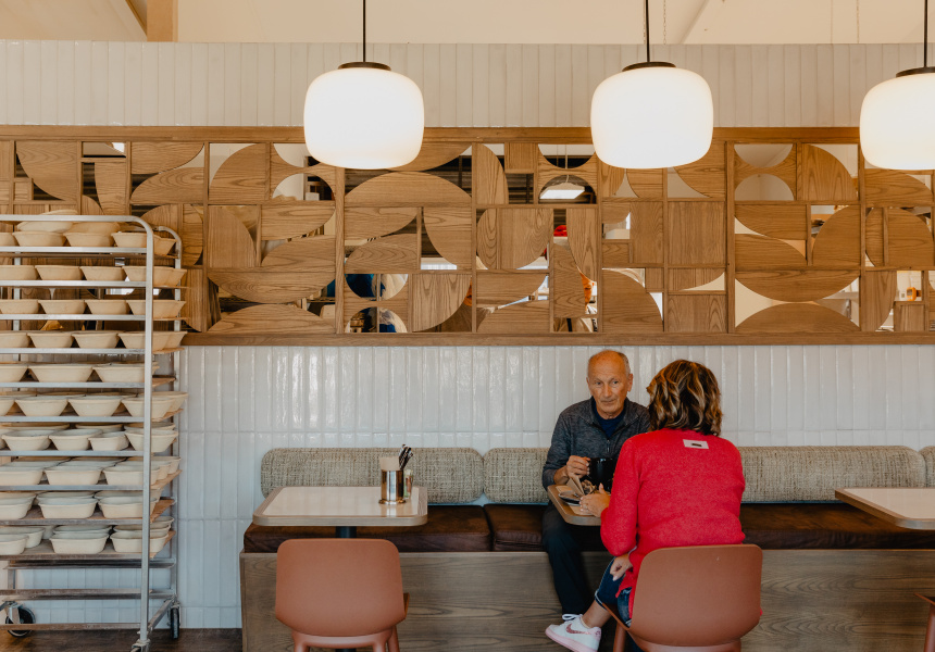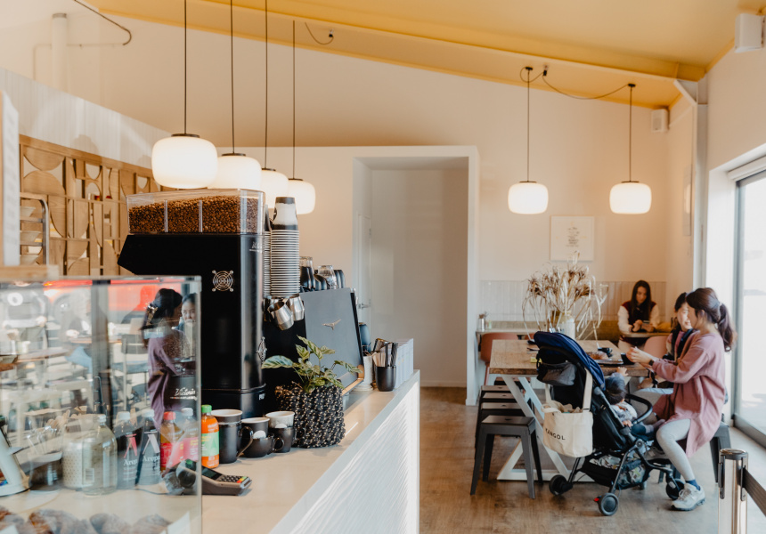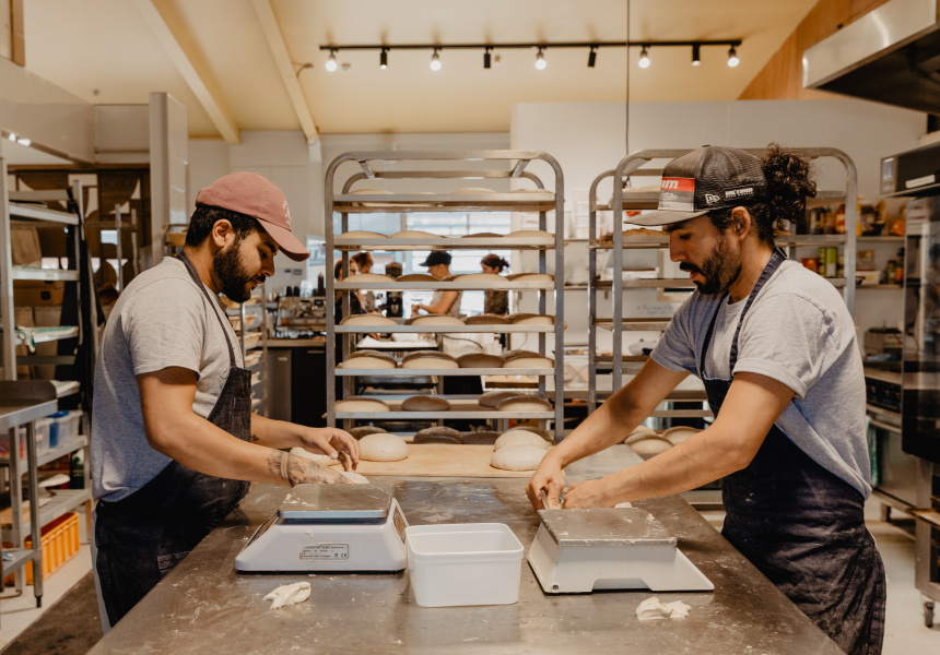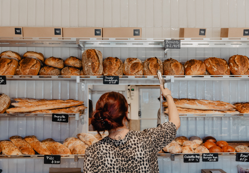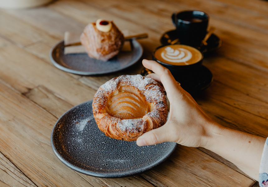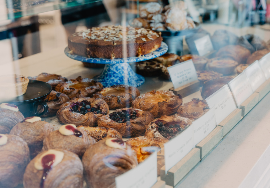 It's owned and run by cook turned self-taught baker Brent Beamish and his wife Kate Beamish. The interior is spacious with a jet-black Victoria Arduino coffee machine, bulbous antique hanging light shades and a custom-made wood partition by local cabinet maker Ian Edelston that separates the cafe from the kitchen.