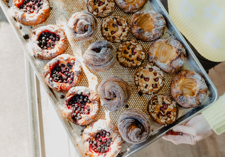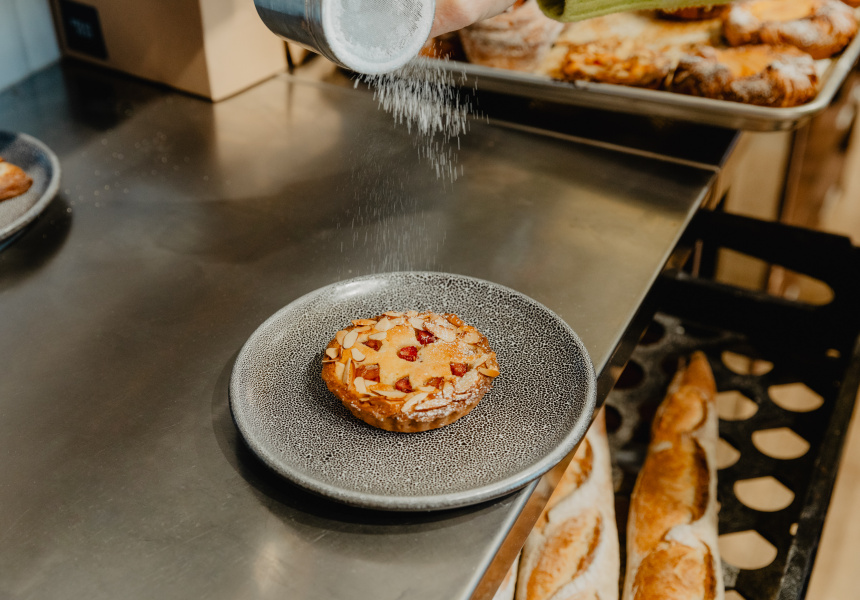 On Saturdays, it’s a 3am start to prepare between 500 and 600 pastries – classic pain au chocolat, croissants, morning buns, cruffins, galette, almond bear claws, and danishes with fillings of apricot and cream cheese custard.