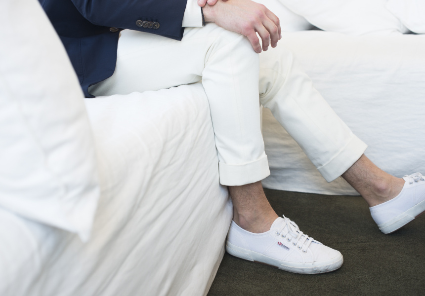 He often goes for a classic look in summer. “Pale sand or beige cotton trousers, with an unstructured dark navy blazer worn over a crisp, clean white or ice-blue shirt,” says Riley, “That with a pair of lace-up shoes or plimsolls is really beautiful and clean.”