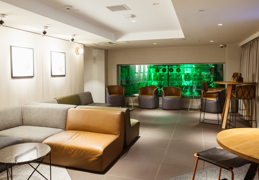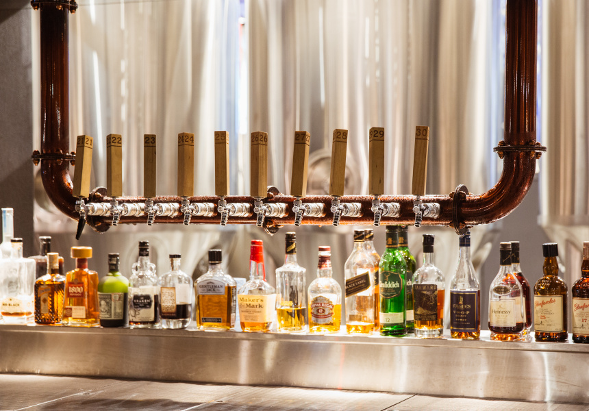 Behind a bar featuring 26 taps, four fermenters loom. Here, head brewer Mark Neal uses wort (ground malt), which is made off site to create a range of brews, stored and showcased in a crazily lit cool room at the back of the bar.