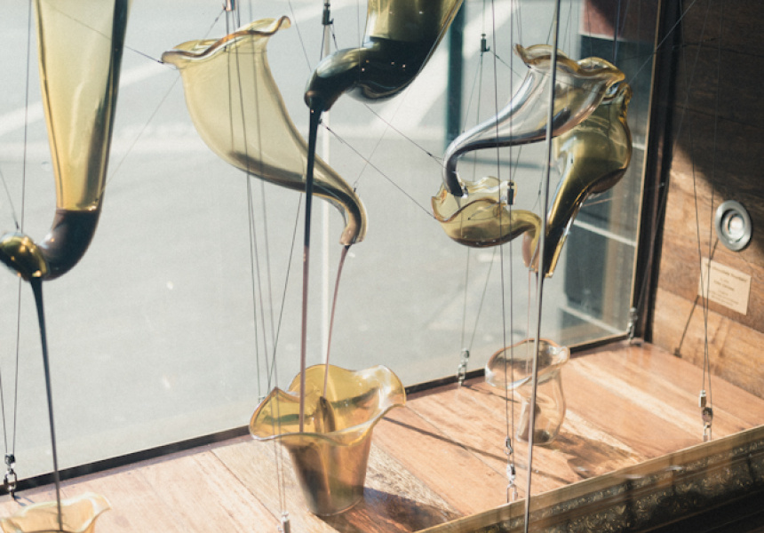 The Willy Wonka-inspired art installation, La Fountain de Cacao, in the front window, featuring chocolate poured from one glass decanter to another on strings, is in itself, worth visiting.