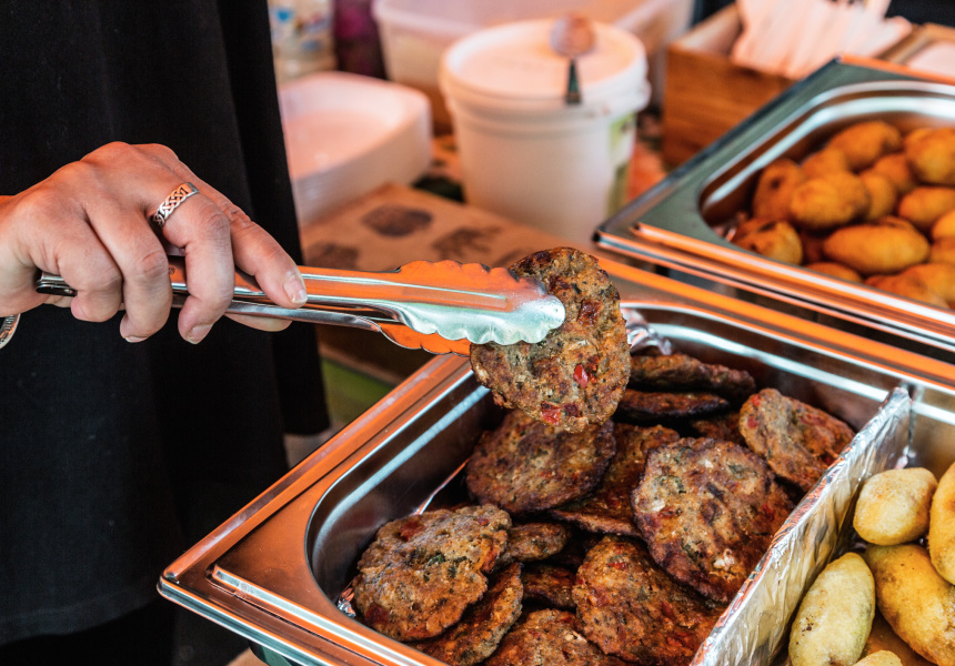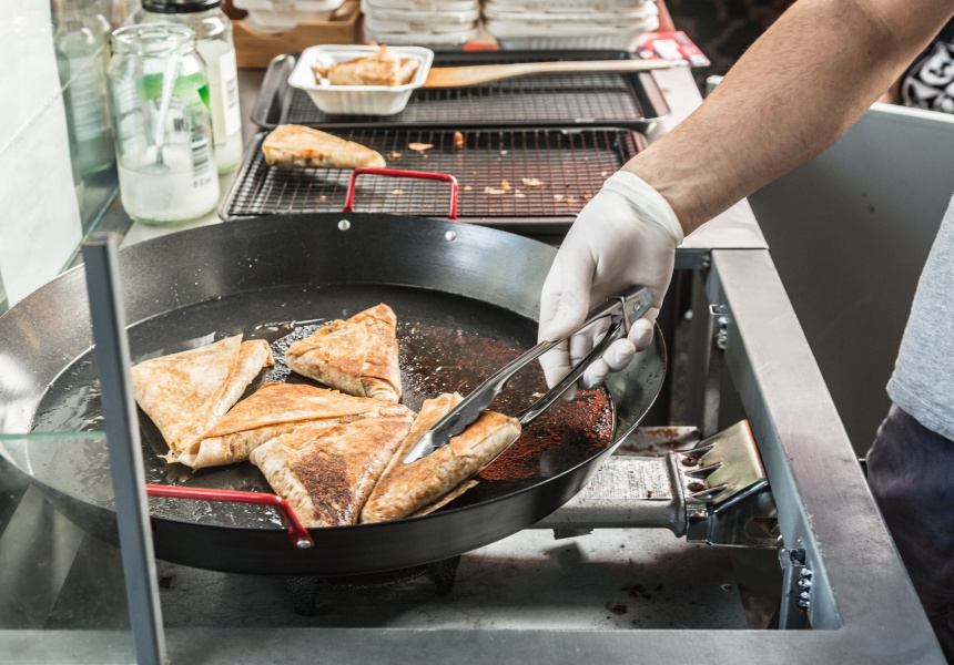Ray is serious behind the hot plate, frying up stacks of sambooseh, a vegetable-filled triangular pastry from Iran that’s much like a samosa. The filling is potato, peas, capsicum, coriander, parsley and dill mixed with cheese.
