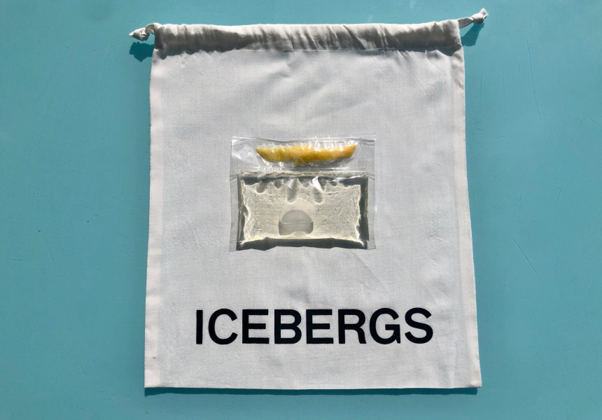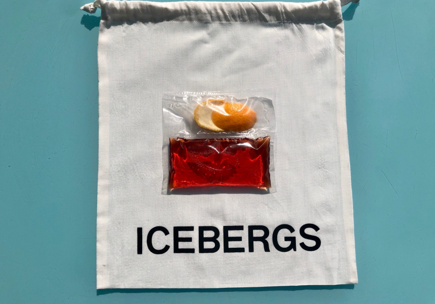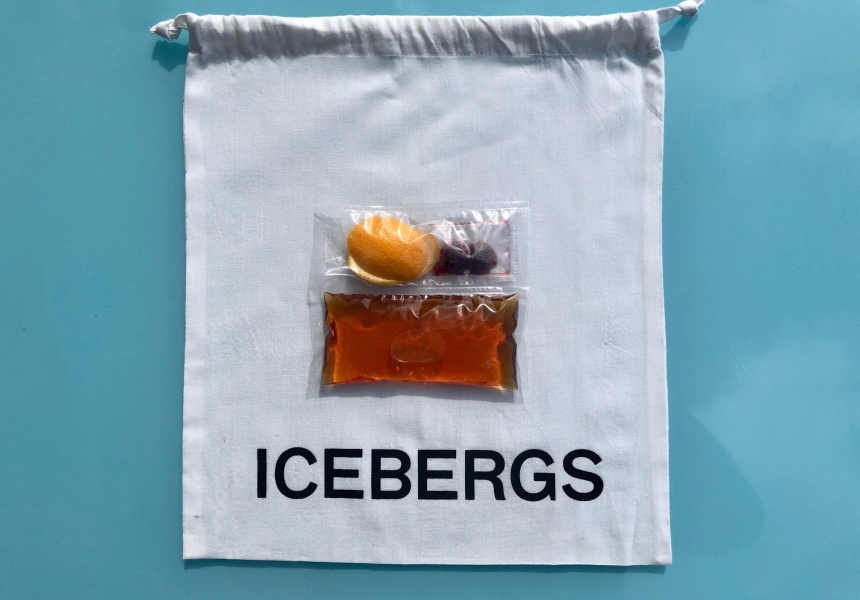 Alongside the four drinks, which come in sealed plastic bags, they’ve popped in a couple of ice cubes chiselled by Sydney’s premium ice-maker Bare Bones (these are for the Negroni and the Old Fashioned), plus garnishes of lemon-peel and orange-skin twists. It all arrives in a signature white drawstring pouch emblazoned with the word “Icebergs”.