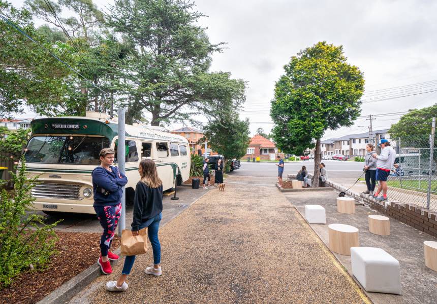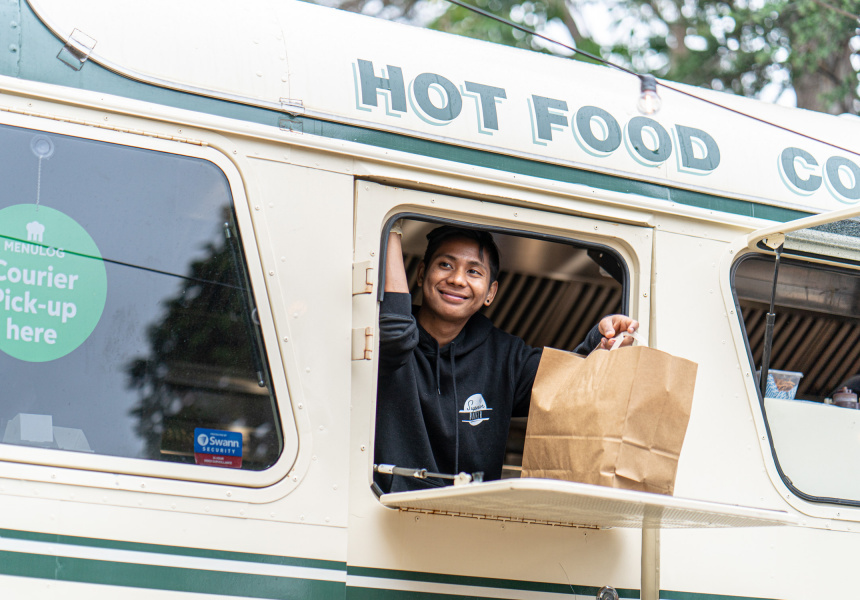 Sullo found an empty warehouse in his home suburb of Mortlake and set up a permanent sister eatery to his Wakeley diner. The vintage bus that once travelled to festivals now takes pride of place out front in the car park and functions as the eatery’s kitchen. The warehouse’s roller door is permanently open, revealing a charmingly kitsch space with astroturf on the ground, palm trees in pots, a handful of low seats and a retro turquoise and white caravan where customers place orders. As Covid restrictions relax Sullo will add more permanent seating.