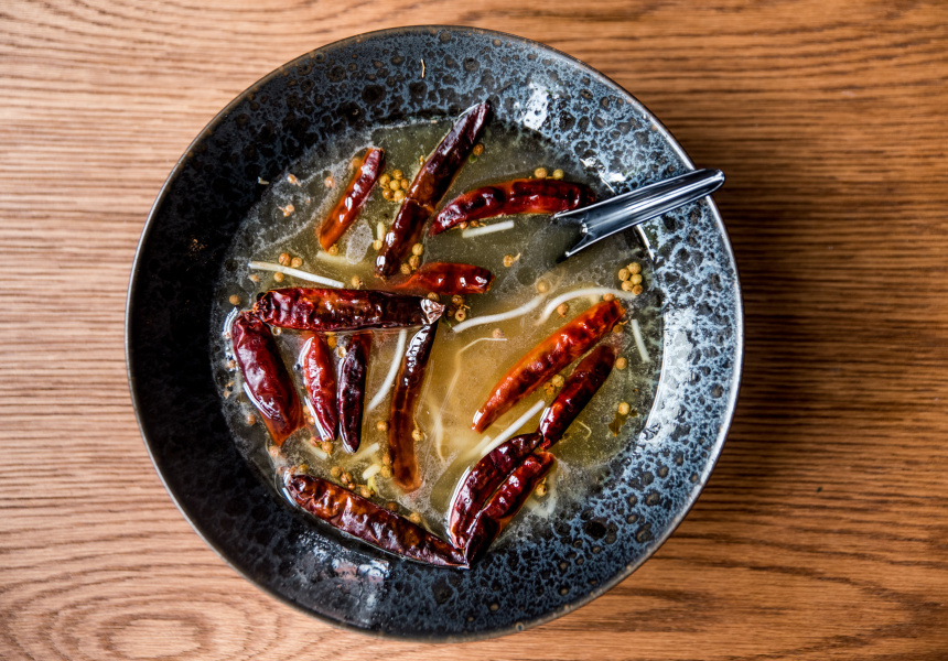 Menu stand-outs include: the two-chilli fish, with salted red chilli and pickled green chilli; and the Chinese-style white-cut chicken. The white-cut chicken appears pink on the plate. “It’s cooked for so long at such a low temperature that it appears undercooked,” says Steer. This process retains the gelatinous texture for which Sichuan cooking is known.