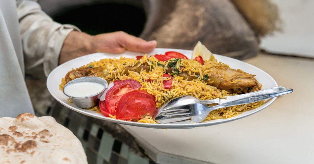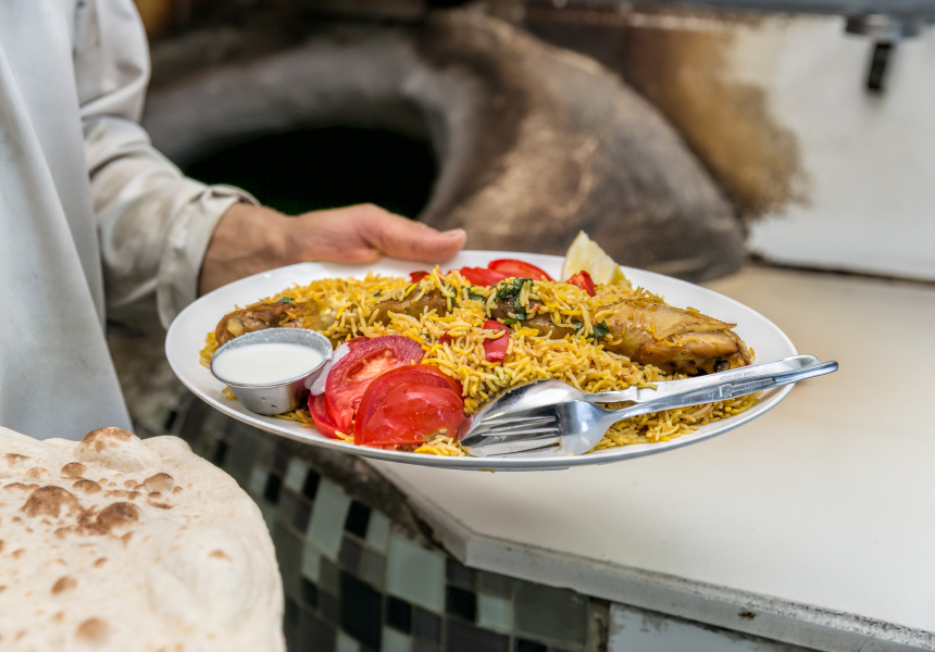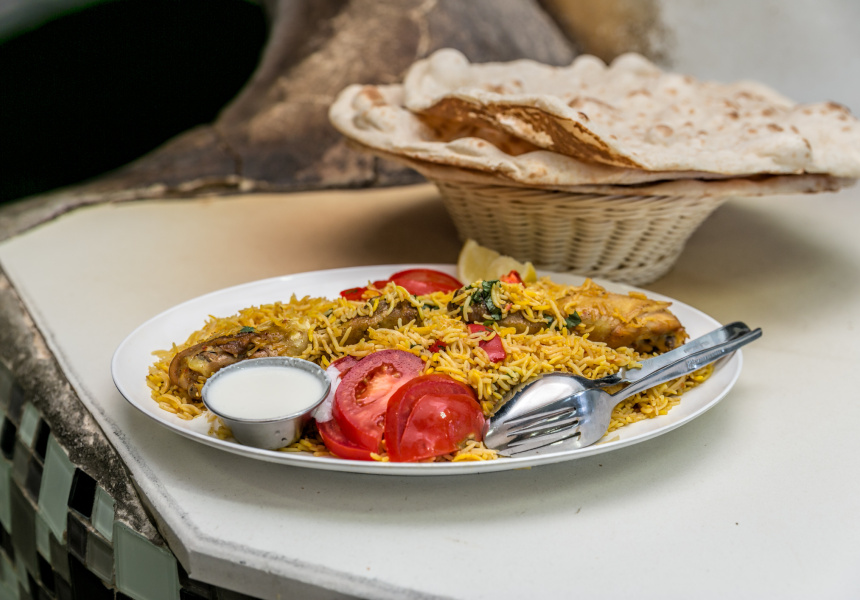 Arabic bread is served with everything, including the delectable saffron-laced rice and chicken biryani.