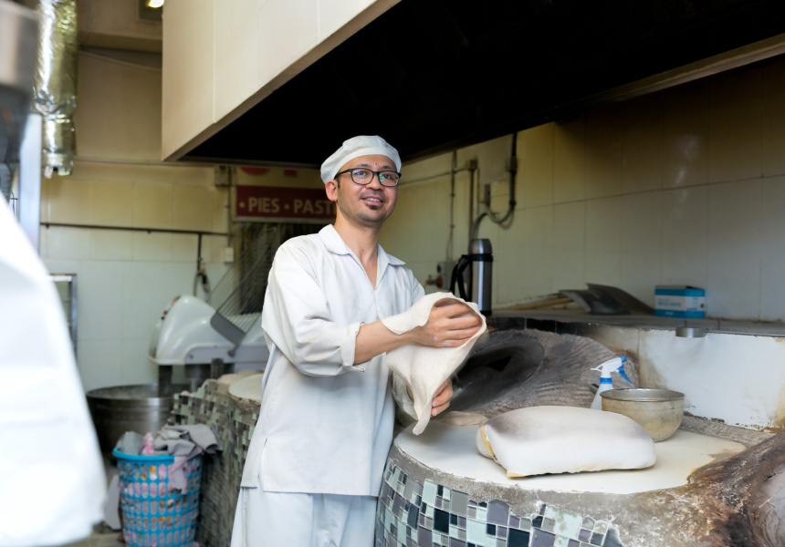 Watching Afghan Sufra owner Haji Salim work is mesmerising. Through the lunch rush he builds elaborate dishes, keeps an eye on cooking lamb skewers, cooking and stretches and bakes stacks of Arabic flatbread.