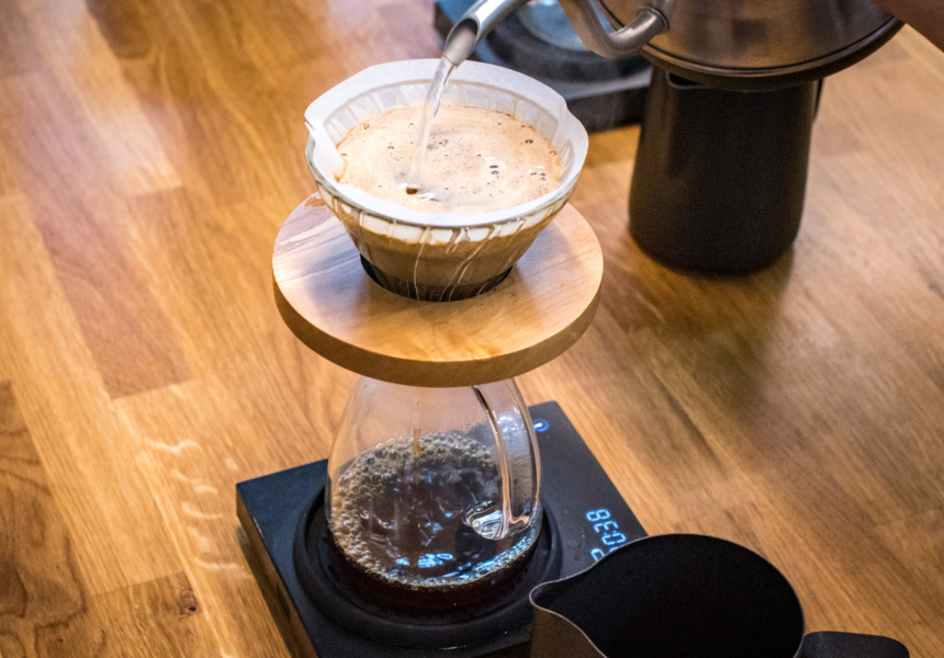 The centrepiece at Humm Coffee Roasters is a Modbar ABR – a rare, expensive and extremely slick underbench coffee machine. Humm was the first cafe in Sydney to get it. Most of the machinery sits below the cafe’s timber countertop. The only clue that coffee is even being made is three visible spouts with curved wood handles: two for making espresso, one for steaming milk.
