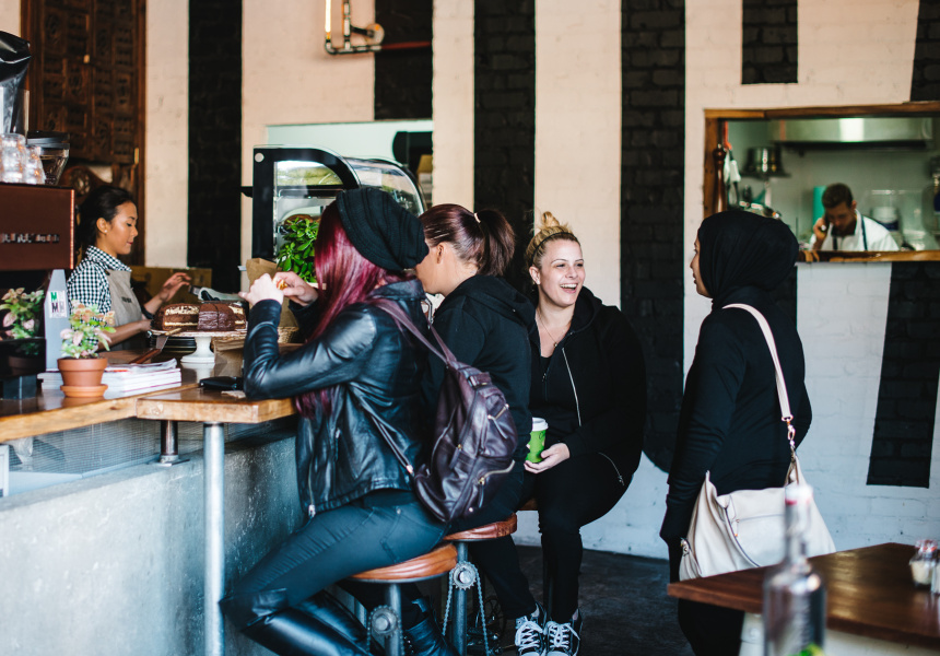 The boiler-room-inspired interior includes details such as exposed-pipe lighting features, antiques and leather bike-pedal stools lining the front counter. Barista and owner Marcus Gorge’s curled moustache is a nice touch.